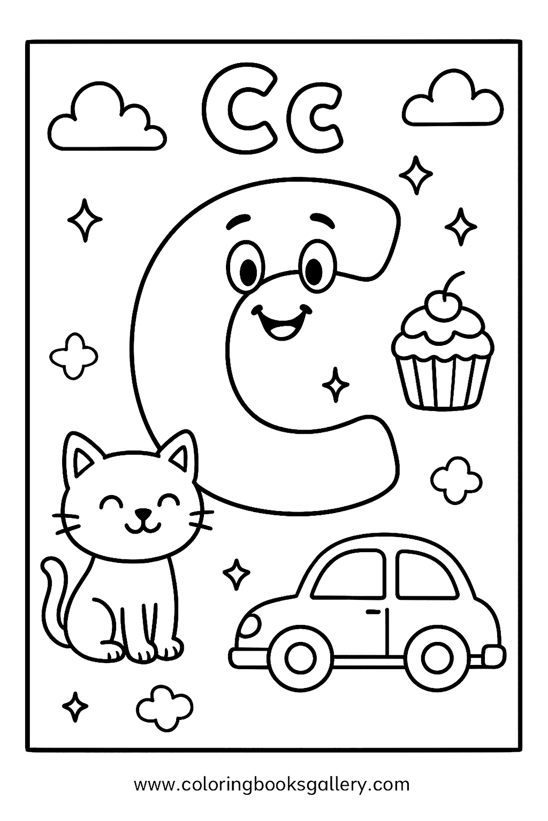 Cute letter c coloring page for kids to learn the alphabet