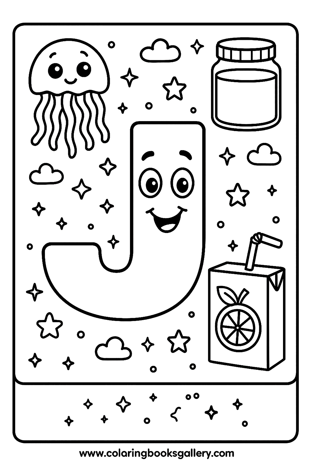 Our cute letter J page features a bold and friendly design that is easy for little hands to color. Children can work on their fine motor skills and learn the alphabet in an engaging way. If you like this, you might also enjoy our Letter I coloring page or start from the beginning with the Letter A coloring page.