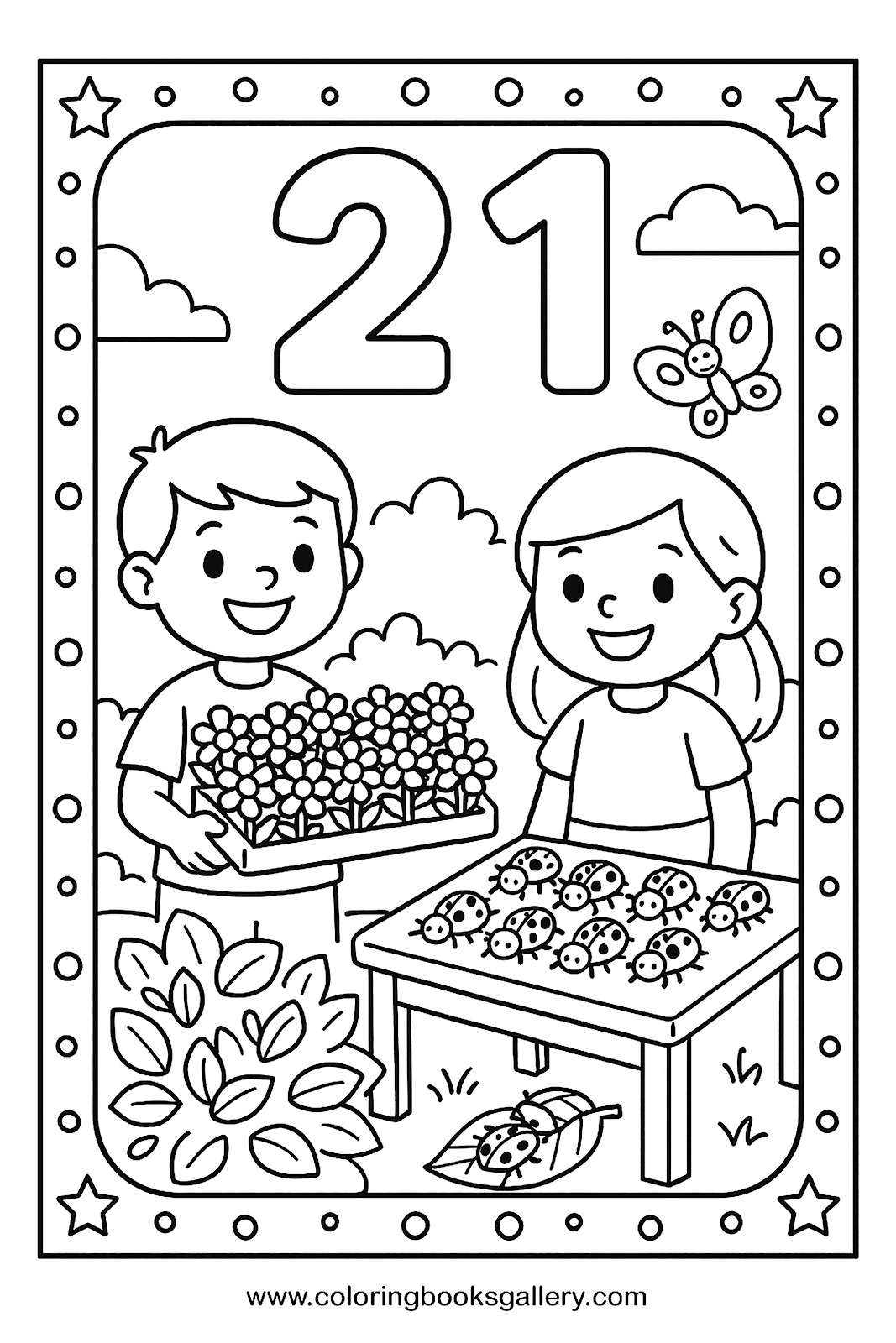 Easy number 21 coloring page for kids to learn counting