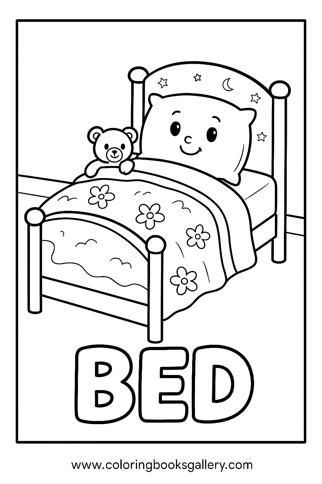 Fun coloring page to learn the English word 'Bed' for kids