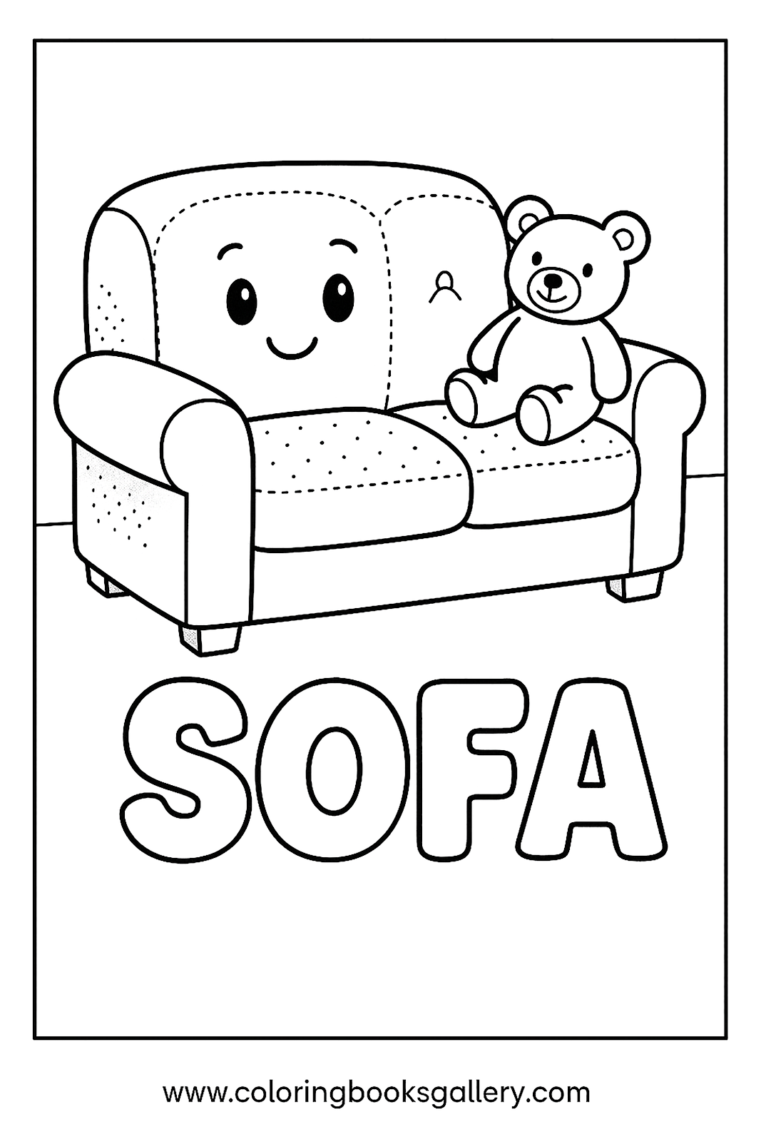 Fun coloring page to learn the English word 'Sofa' for kids