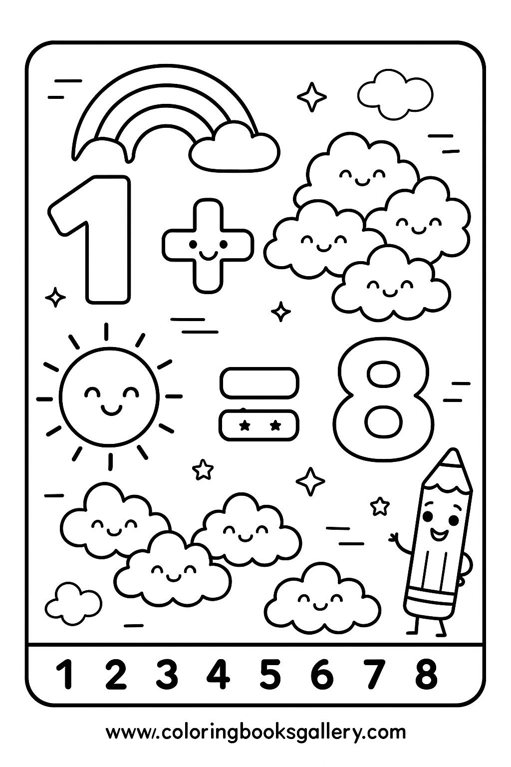 Help your child master addition in a creative way with our 1 + 7 coloring page! This easy-to-print math worksheet makes learning simple arithmetic fun and stress-free. Kids can enjoy coloring the friendly characters while practicing their math skills, making it a wonderful blend of education and creativity.